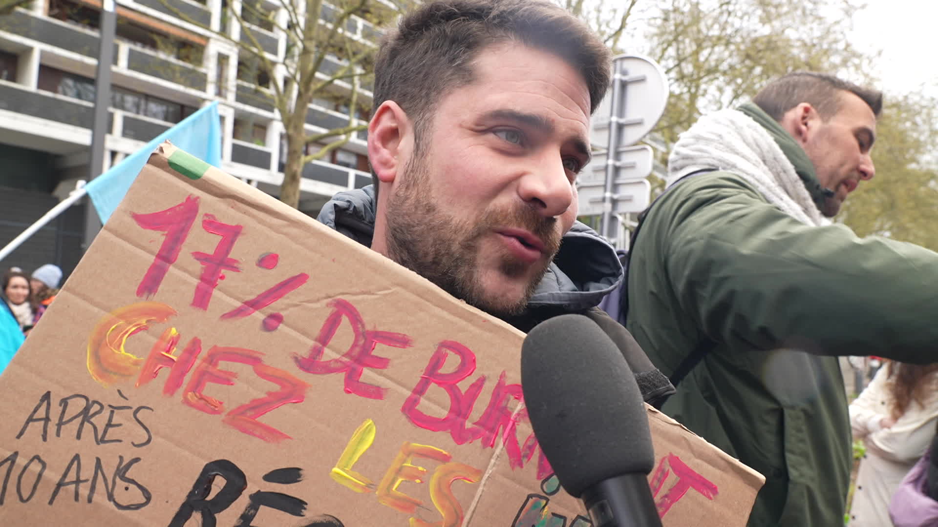 Romain Lemaitre, school teacher, explains why he is striking and demonstrating.