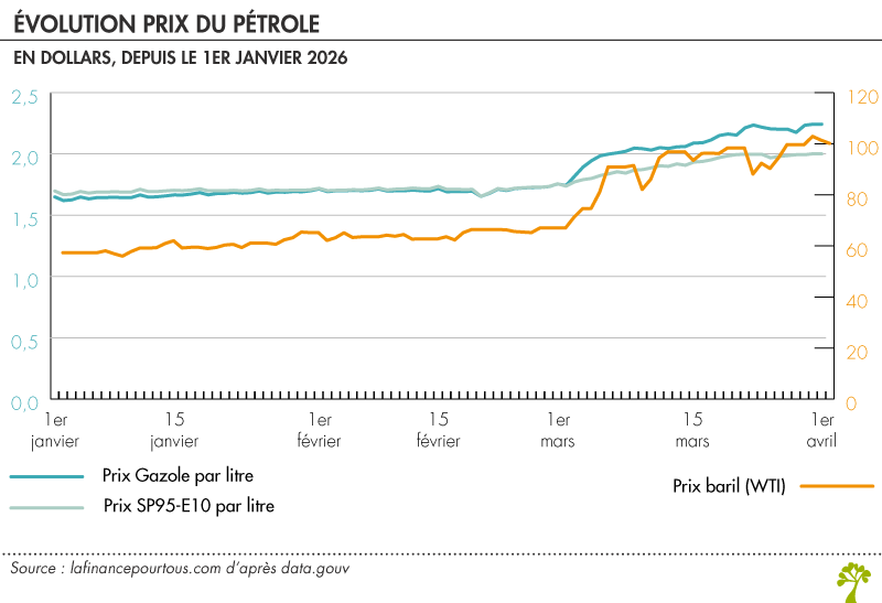 The Strait of Hormuz is a strategic crossing point. Around 20% of global consumption passes through it (particularly towards Asia). Since the blocking of the strait, traffic has collapsed: from 132 boats on February 26 to only 6 on April 2, 2026. Faced with this scarcity, oil prices have soaredgoing from $67.02 to $110 per barrel (WTI).