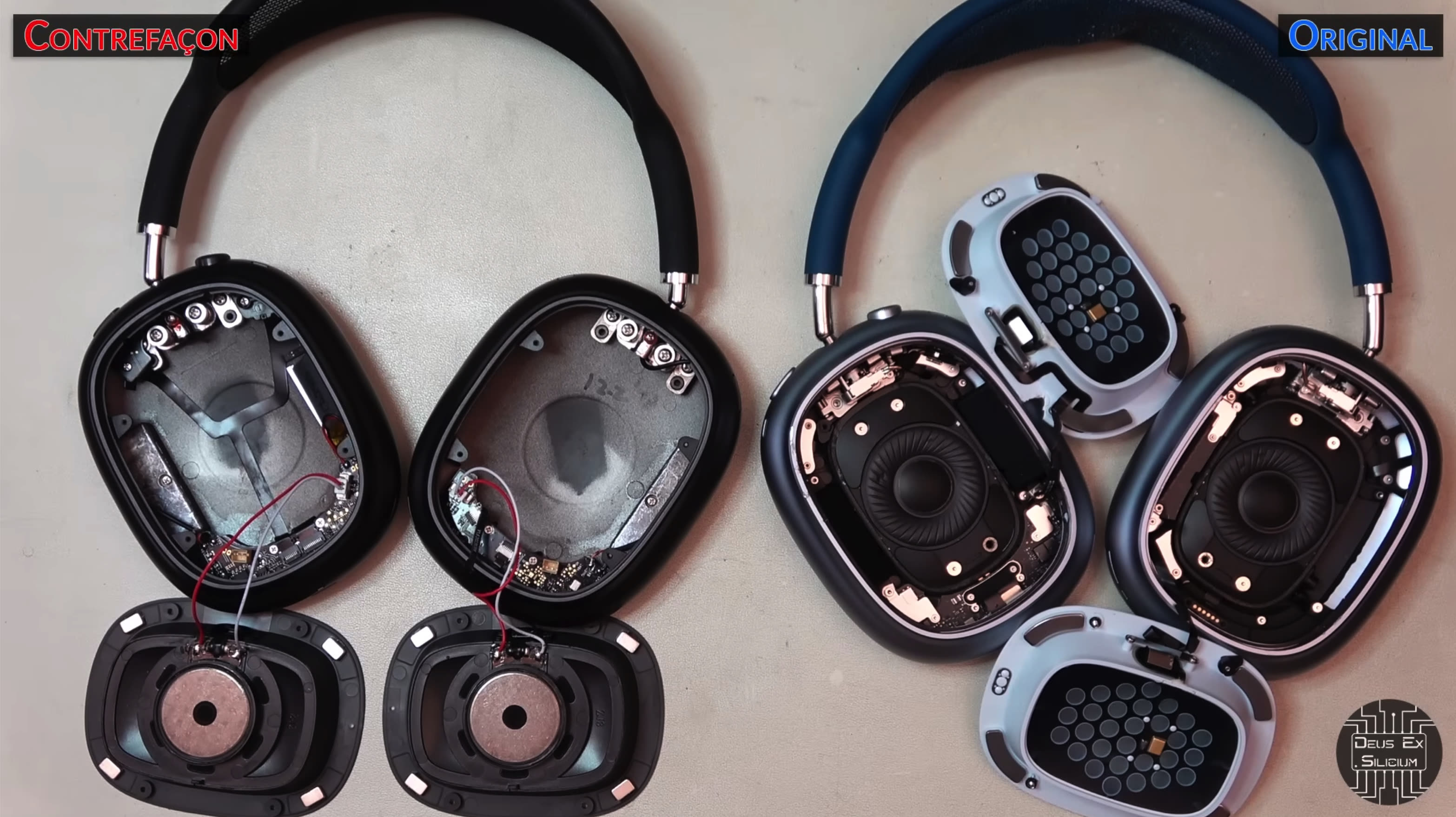 The most striking contrast is between the exterior and the interior. The shell, frame, and fabric seem genuine, to the point where the YouTuber believes they are real and come from the same factory as the original products. But everything inside is fake. “It’s important to understand that the electronics of this counterfeit, including the speakers, are on par with what you can find in a $20 Chinese Bluetooth headset sold online,” explains Deus Ex Silicium.