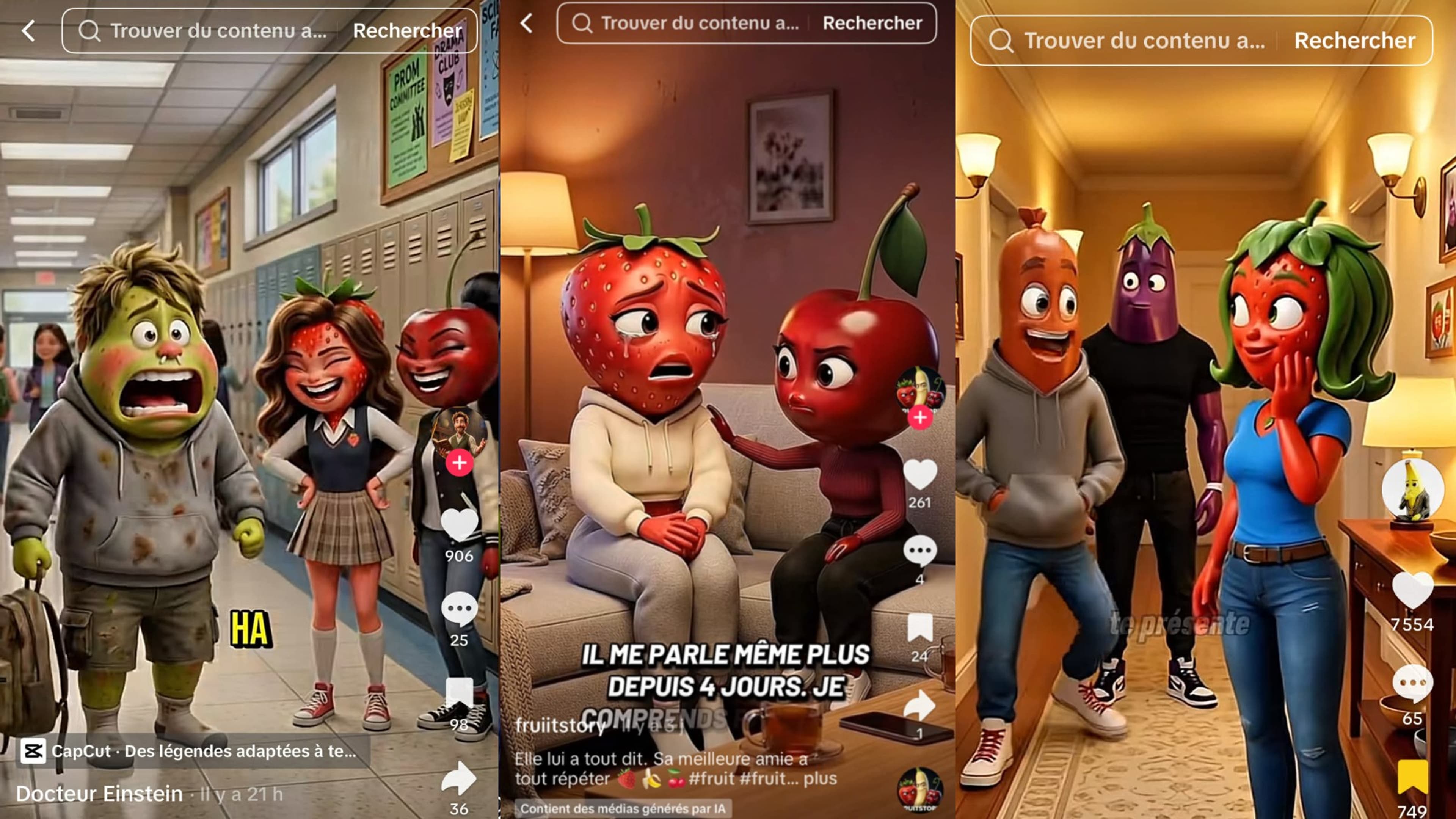 Infidel apples, bananas flirting with eggplants and giving birth to chocolate squares… In just a few days, Priscille became addicted to this new form of AI-generated stories on TikTok. Every evening, this 31-year-old woman gets caught up in these short videos reminiscent of Pixar animated films, which depict love and betrayal stories among fruits, vegetables, and other food products like pieces of chocolate, cheese, or pasta.