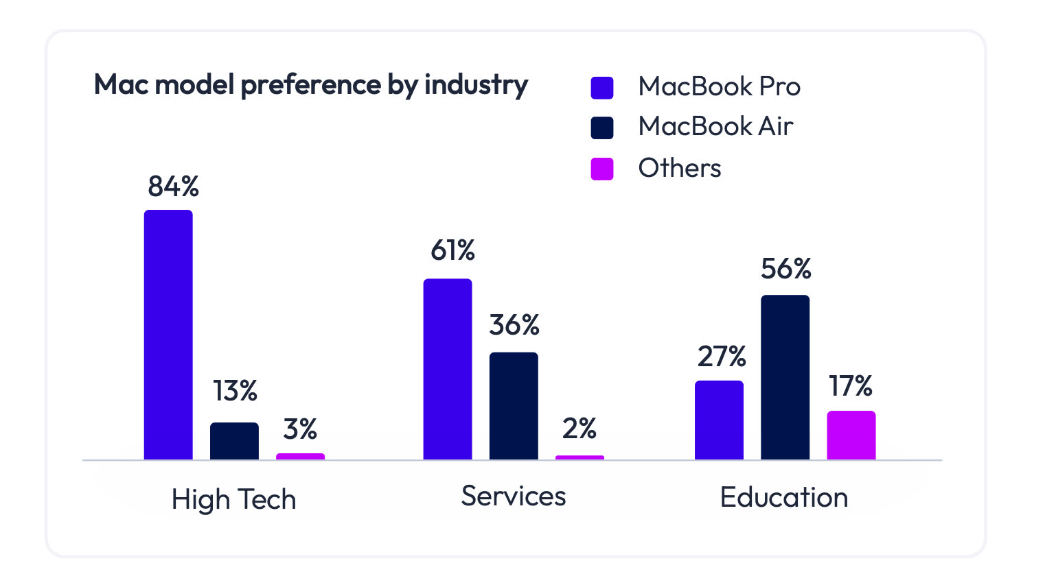 We learn, for example, that the most popular Macs in the high-tech sector are the MacBook Pro, well ahead of the MacBook Air and the others (Mac mini, iMac, etc.). In companies linked to services, the gap is less significant, while in education, it is the MacBook Air which is rather put forward.
