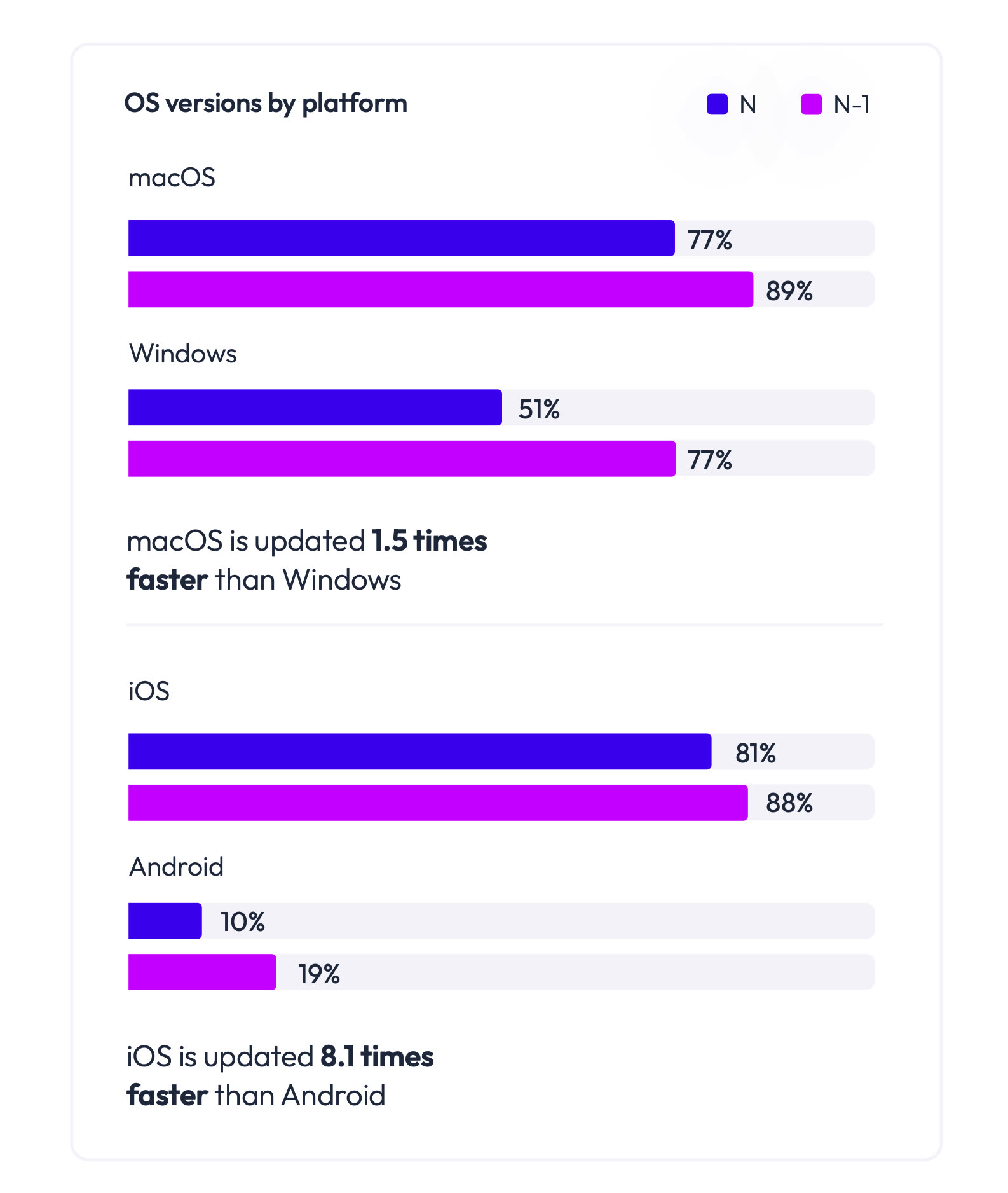 The report shows that browsing is split between Chrome (43%), Edge (43%) and others (including Safari) at 16%. In terms of operating systems, Mac users generally have the latest version (77%) or the previous version (12%). This is significantly more than under Windows, where only 51% of companies are a priori under Windows 11. Under iOS, it’s the same thing: 81% with the latest version, 7% with the previous one and the rest with an old version. On Android, the latest version is only 10% and the previous one is 9%.