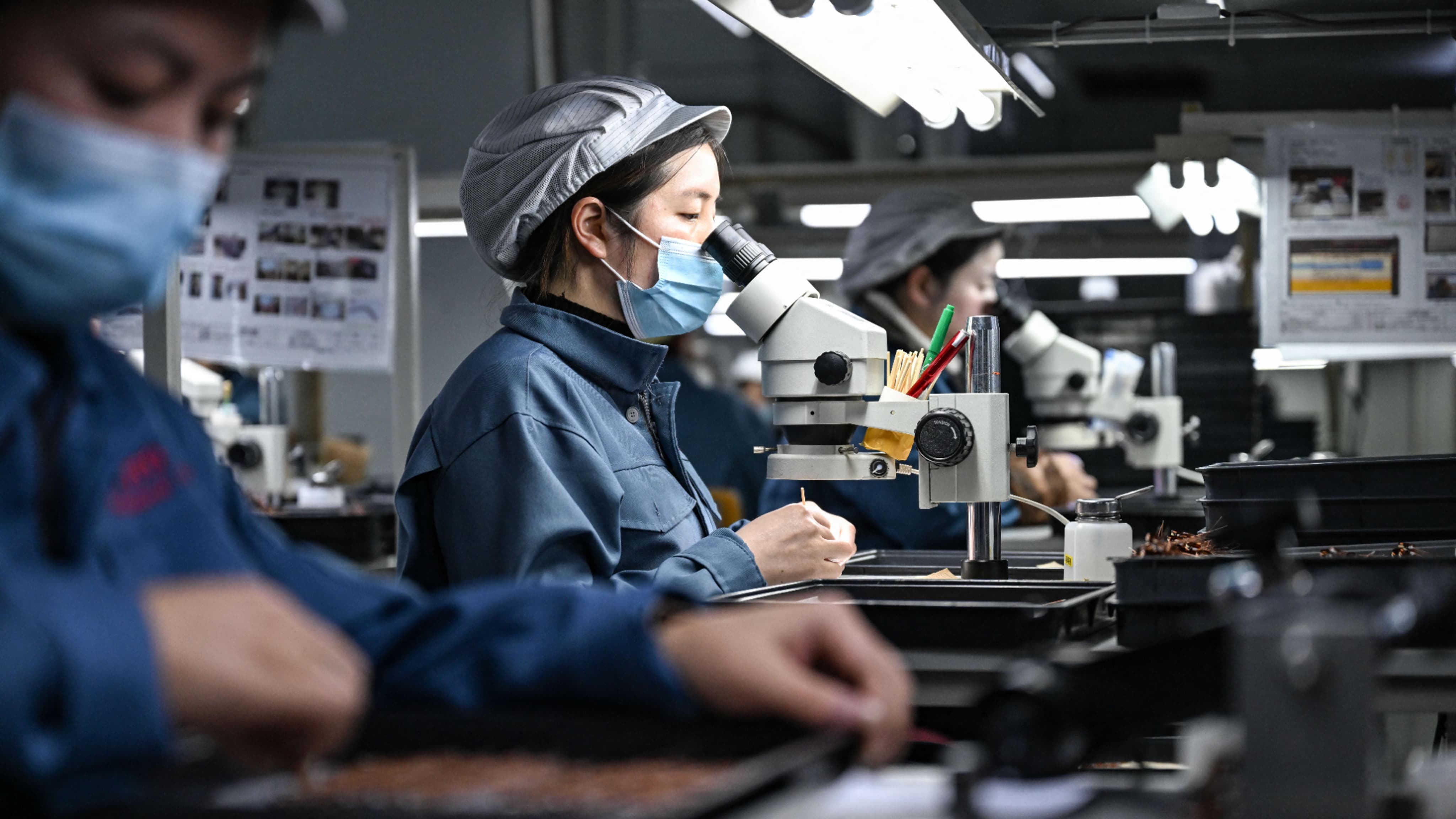 Workers produce coils for audio equipment in a factory of electronic components in the Guizhou province in southwest China, on January 20, 2026 (illustration photo) © Photo by Imaginechina via AFP